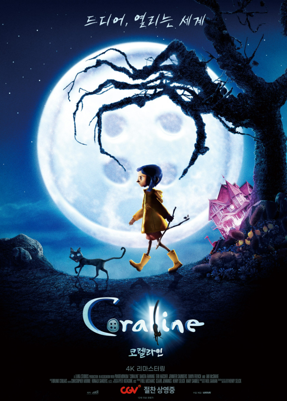 감독은 스톱 모션 애니메이션 계의 거장으로 평가받는 헨리 셀릭으로 '팀 버튼의 크리스마스의 악몽'의 감독이기도 합니다. 코렐라인은 제작기간 3년 6개월로 4K UHD 해상도, 오리지널 사운드트랙 그리고 음향효과까지 재녹음되었습니다. 원래는 주인공 코렐라인의 목소리 역할을 했던 다코타 패닝으로 실사 영화가 만들어지려는 계획이 있었으나 검은 고양이의 실사화를 두고 어렵다는 의견으로 인해 애니메이션으로 만들어지게 됩니다.